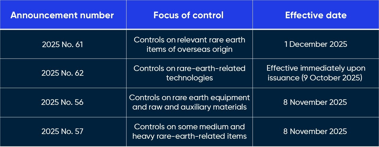 On 9 October, immediately following China's National Day holiday, the Ministry of Commerce, in conjunction with the General Administration of Customs, issued four announcements concerning export controls on rare earth materials and technologies. These measures represent a significant enhancement of China's export control framework for rare earths.